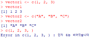 vector를 만들기 위해서는 c( )를 사용하며, 들어가는 각 값들을 콤마( , )로 구분시켜 주면 됩니다.